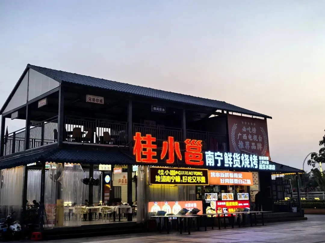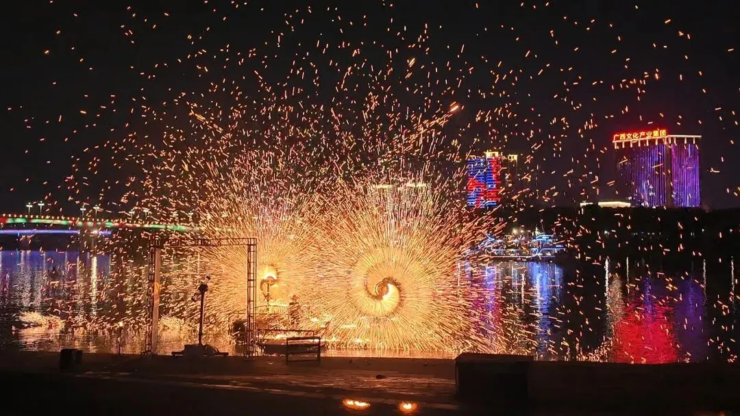 晚上的邕江边金光闪闪,游船码头灯火通明,火秀表演值得40元的门票,江边码头一排排驻足夜赏的不论是牛马还是游人,一胆陶醉的表情岀卖了他们此刻的松驰。