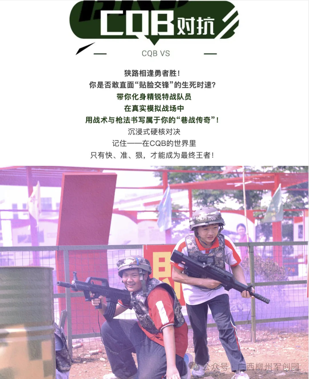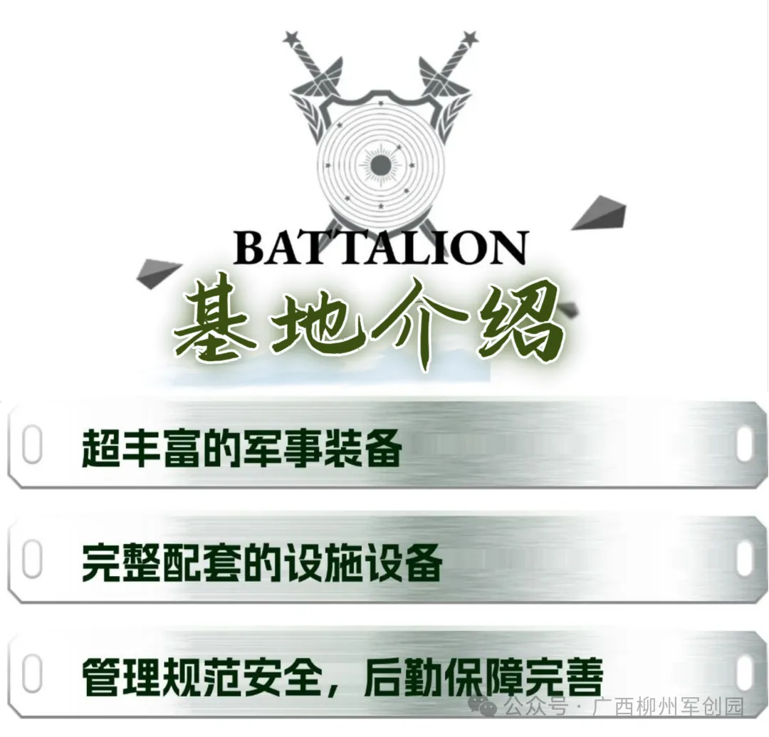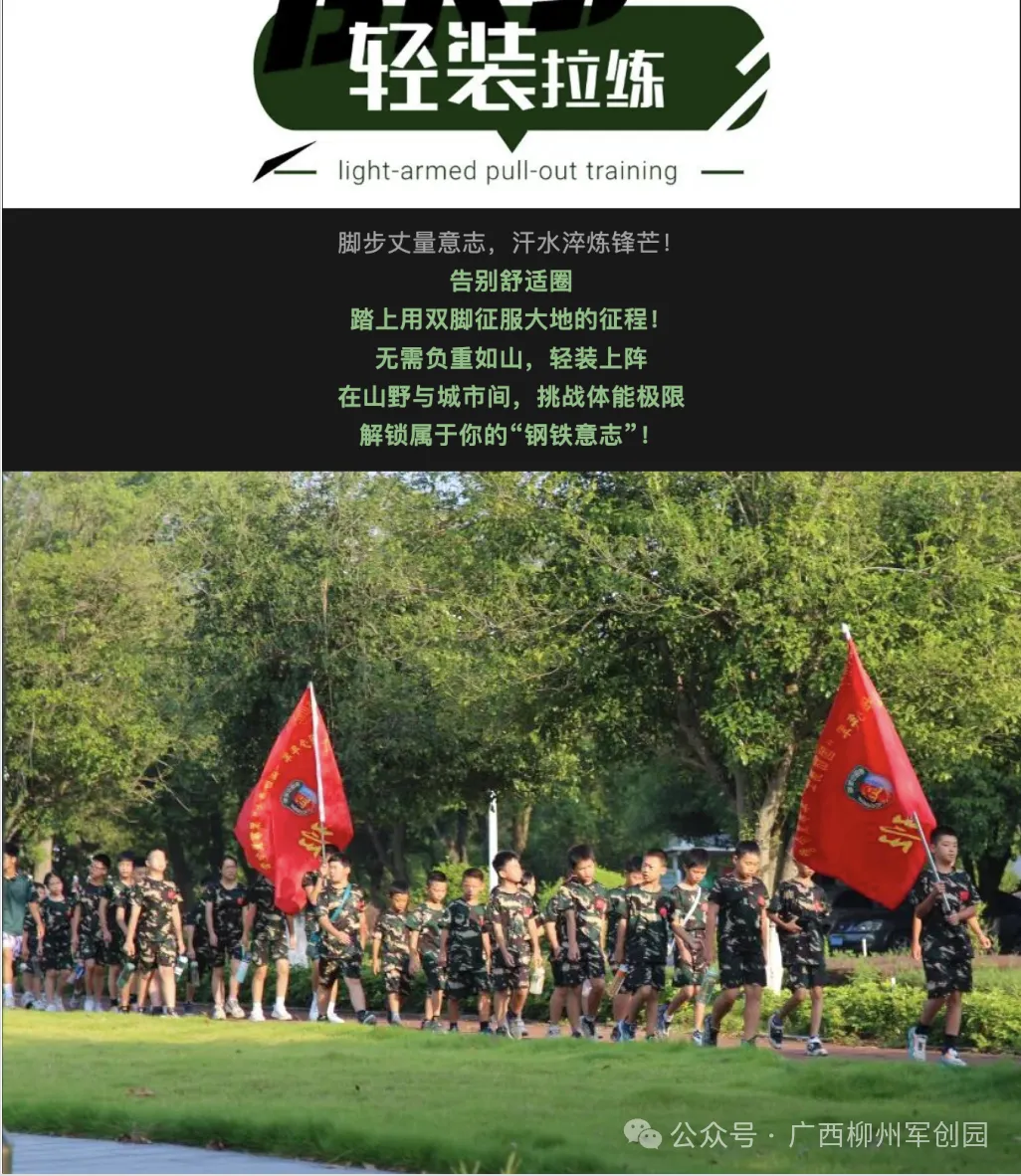 广西柳州军创园坐落于广西壮族自治区柳州市柳江区新兴迎宾路12号-16。总占地5.8万平方米,总投资1600万元,分三期阶段建设。现已完成3.3万平方米,五大核心区域全部建成,阶段投资600余万元。园区秉持着“普及全民国防教育,强化国防安全意识,传承红色军事文化,弘扬爱国主义精神”的建设理念,打造广西一流的国防教育基地,园区是集教育、旅游、休闲为一体的“军文旅”综合体,园区内设施完善,设立军事装备体验区,思政教育学习区、素质拓展培训区、学农劳动体验区、休闲娱乐区5大核心板块,同时拥有能容纳500人的营房、阳光餐厅及千人阅兵大操场,集国防教育、思政教育、军事体验,学校研学、学军学农、冬夏令营训练、文化休闲、素质拓展、励志特训、会务培训、党建培训、团建活动等综合体。