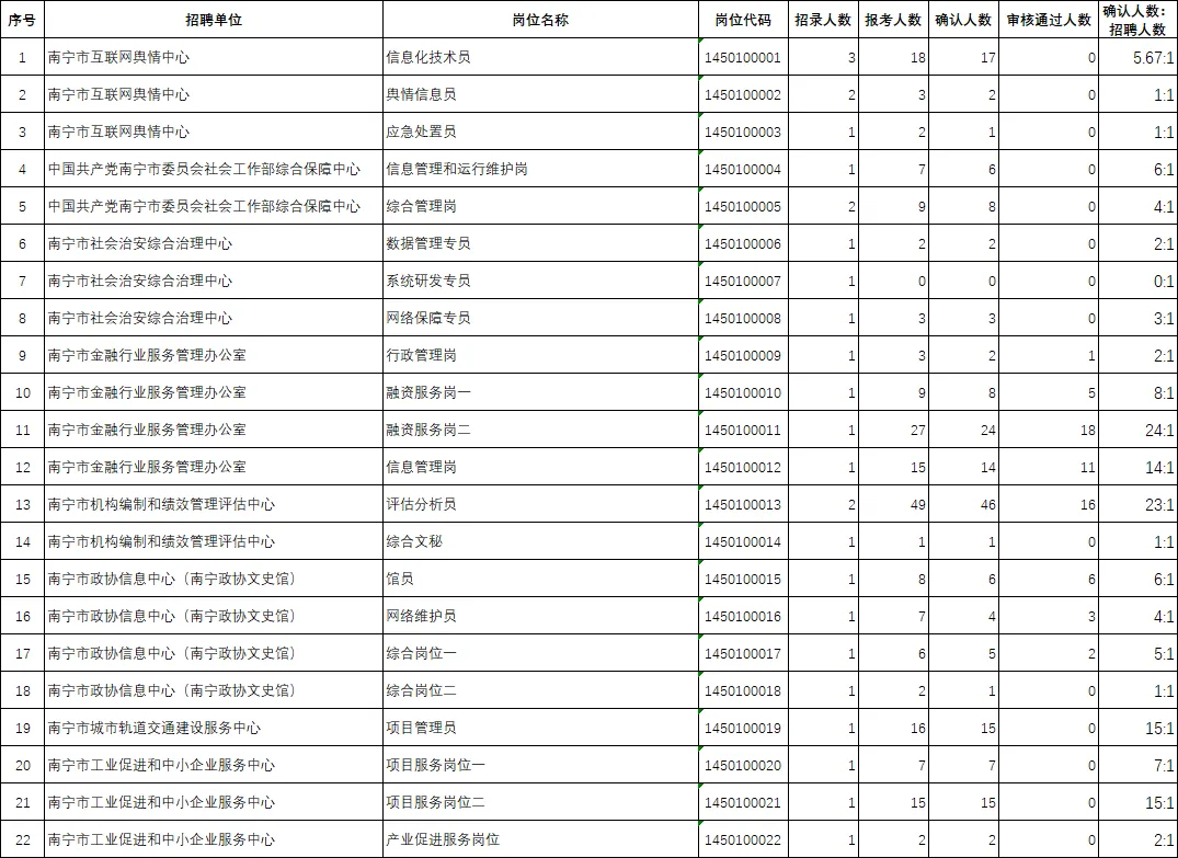 截至1月27日9时,南宁市事业单位考试报名人数最多的职位是沛鸿民族中学,政教干事岗位,已有77人报名,该岗位招聘1人!最高报录比 77:1