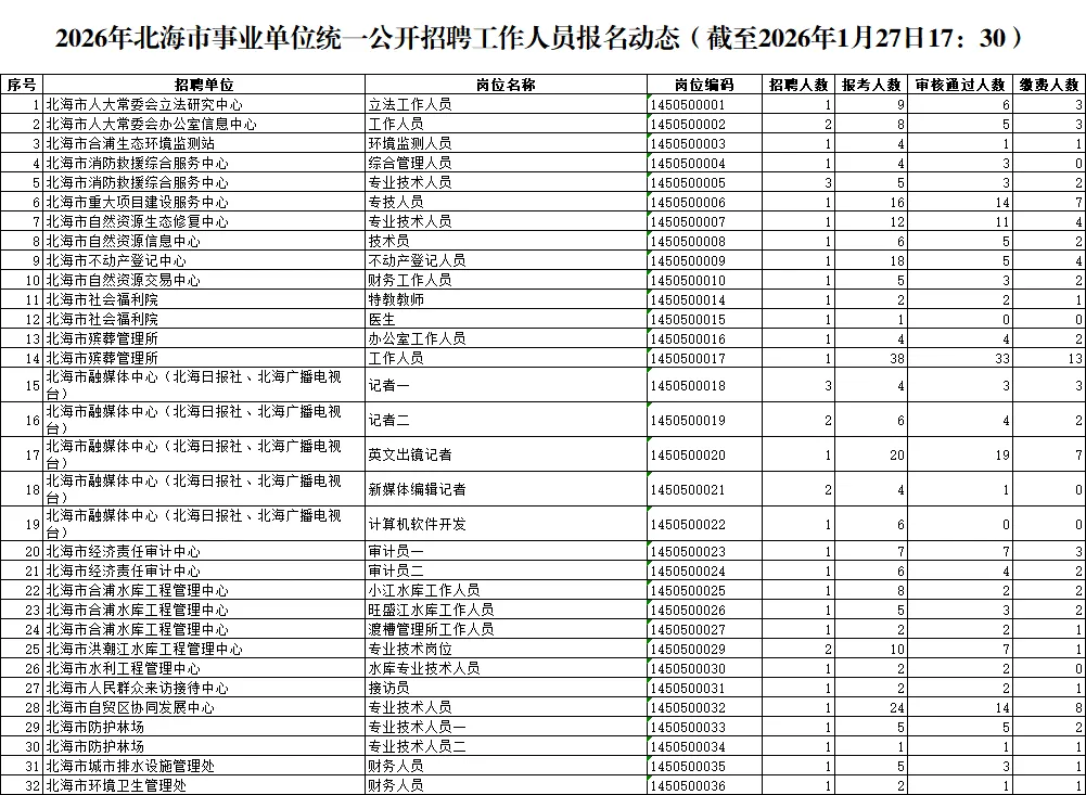 今日北海市广西事业单位官方报名人数发布!点击快速检索事业单位岗位报考人数