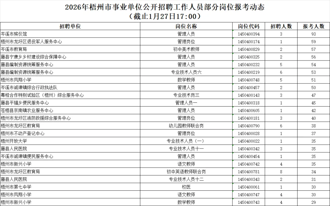 截至1月27日,梧州事业单位考试报考人数最多的职位是岑溪市殡仪馆,招录3人,已有93人报名。