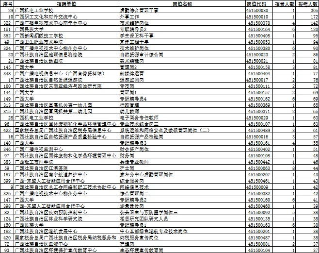 截至1月27日15时,区直市事业单位考试报考人数最多的职位是广西机电工业学校的后勤综合管理干事,招录1人,已有305报名。