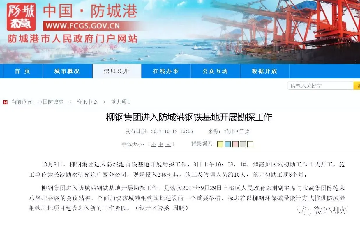 来自防城港市人民政府网站的消息称,2017年10月9日,柳钢集团进入防城港钢铁基地开展勘探工作。并称这是落实2017年9月29日广西壮族自治区人民政府陈刚副主席与宝武集团陈德荣总经理会谈的会议精神,全面加快防城港钢铁基地建设的一个重要举措,标志着以柳钢环保减量搬迁方式推进防城港钢铁基地项目建设进入新的工作阶段。