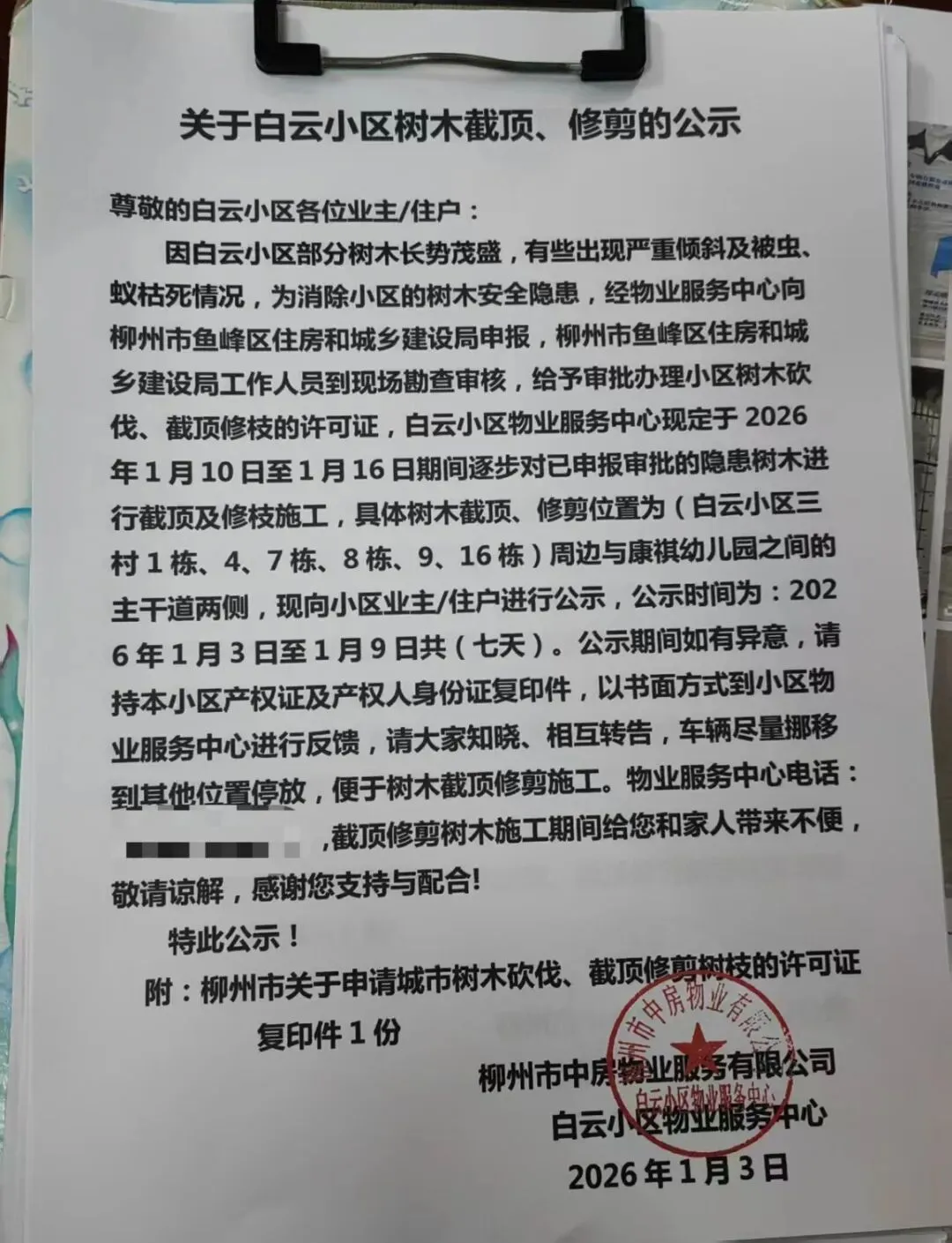 骆女士向记者提供了《关于白云小区树木截顶、修剪的公示》及《鱼峰区砍伐城市树木许可证》。材料显示,2026年1月10日至1月16日,物业将逐步对白云小区一村、三村已申报审批的39棵隐患树木进行截顶及修枝,其中包括对14棵羊蹄甲修枝、6棵小叶榕截顶截枝等。