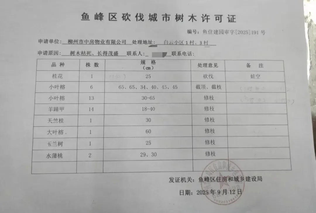 随后,记者来到柳州市中房物业有限公司白云小区物业服务中心。相关负责人骆女士表示,小区部分树木严重倾斜或遭虫蚁蛀死,为消除安全隐患,物业向鱼峰区住建部门申报后,获批砍伐树木相关许可证,随后聘请第三方对隐患树木进行了砍伐、截顶、截枝和修枝作业。