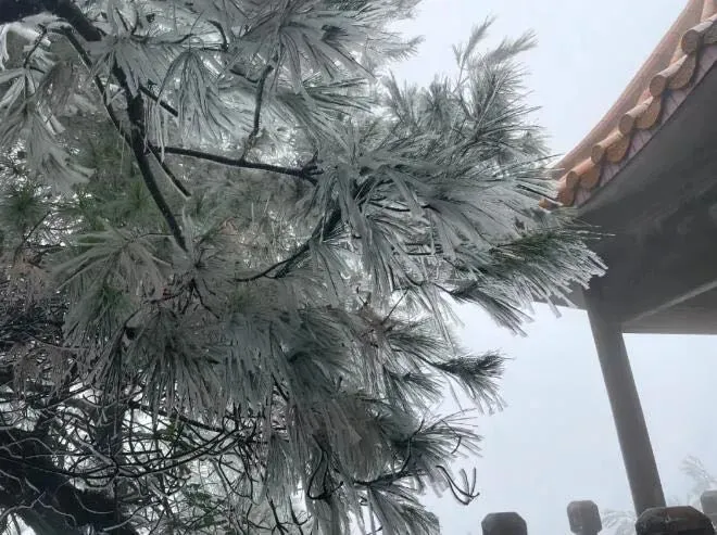 山脚已见寒色,往日葱茏的草木覆了一层薄霜,石阶上凝着细碎的冰粒,踩上去咯吱作响,似是山林为远客奏响的迎宾曲。沿缓道拾级而上,便入了雾凇的世界——松枝不再是墨绿,而是被冰雪裹成了银珊瑚,每一根松针都凝着冰晶,风过处,碎雪簌簌落下,沾在肩头,凉丝丝的,却不刺骨。道旁的灌木也换了妆,枯枝垂着冰溜,长短不一,如水晶帘幕,阳光穿过时,折射出细碎的银光,晃了眉眼,也柔了山林的冷意。