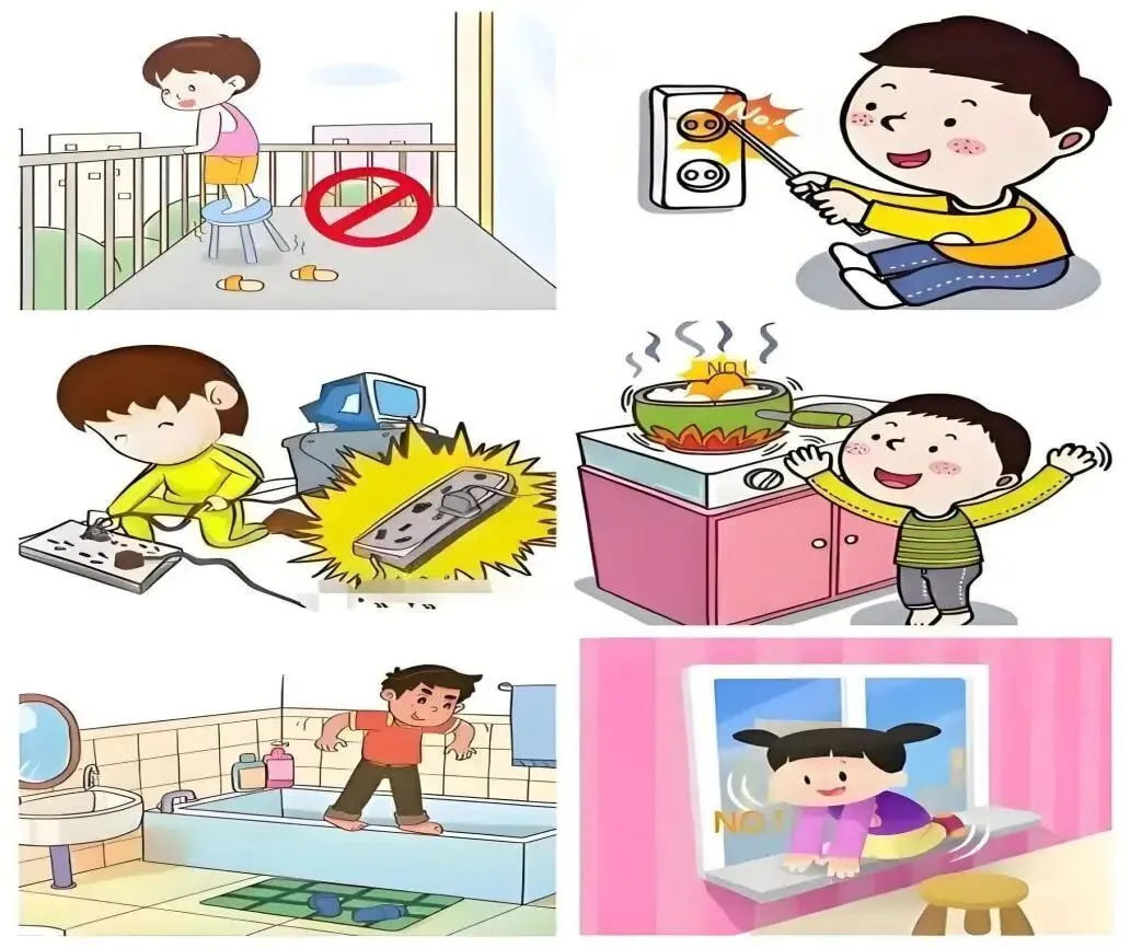 1. 家长应加强家中电源、燃气、热水器等电气设备的安全管理,教导孩子正确的使用方法,防止发生触电、中毒、烫伤等事故。 2.做好家庭阳台、窗台、楼顶平台等区域的安全防护,教育孩子不攀爬,谨防摔伤、高空坠落;教育孩子不向楼下抛扔物品,并让孩子牢记110、119、120等报警电话。 3.不留孩子独自在家;教育孩子独自在家时,不给陌生人开门,注意防骗、防盗、防抢。