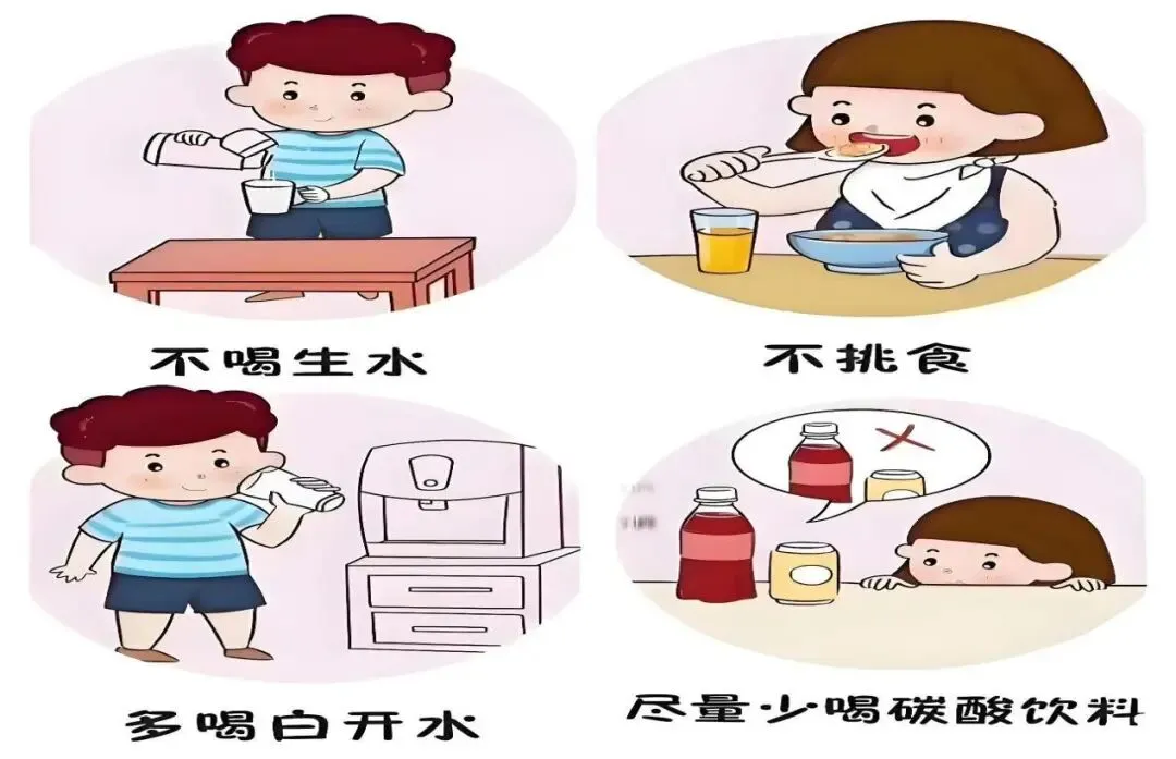 教育孩子提高食品卫生安全意识。注意个人卫生,防控流感;注意饮食卫生,防止食物中毒,不吸烟喝酒,不喝生水、不摘食野果(菜)、不购买不卫生的“三无”食品。