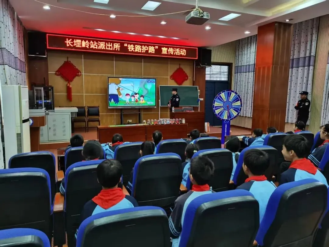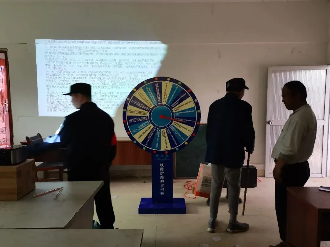 活动定制大转盘教具,将铁路安全知识转化为20个趣味问题,并配备动画宣传片。在中心小学,学生抢答转盘问题,正确率超95%;针对通水坡老年群体,民警口头提问并讲解违法行为后果,普及铁路安全知识。