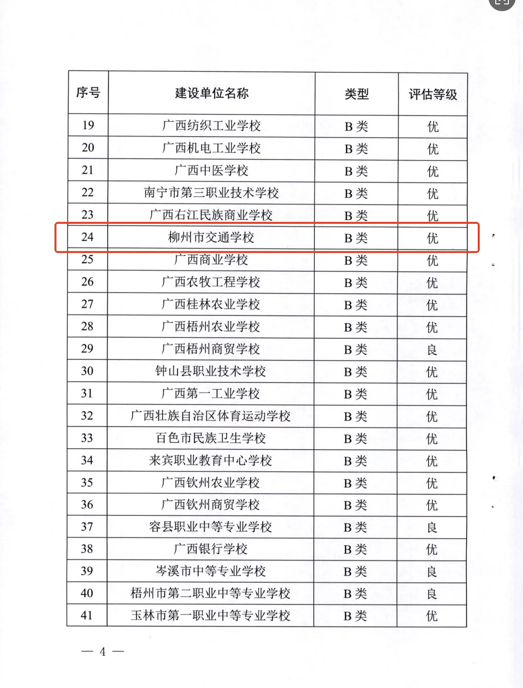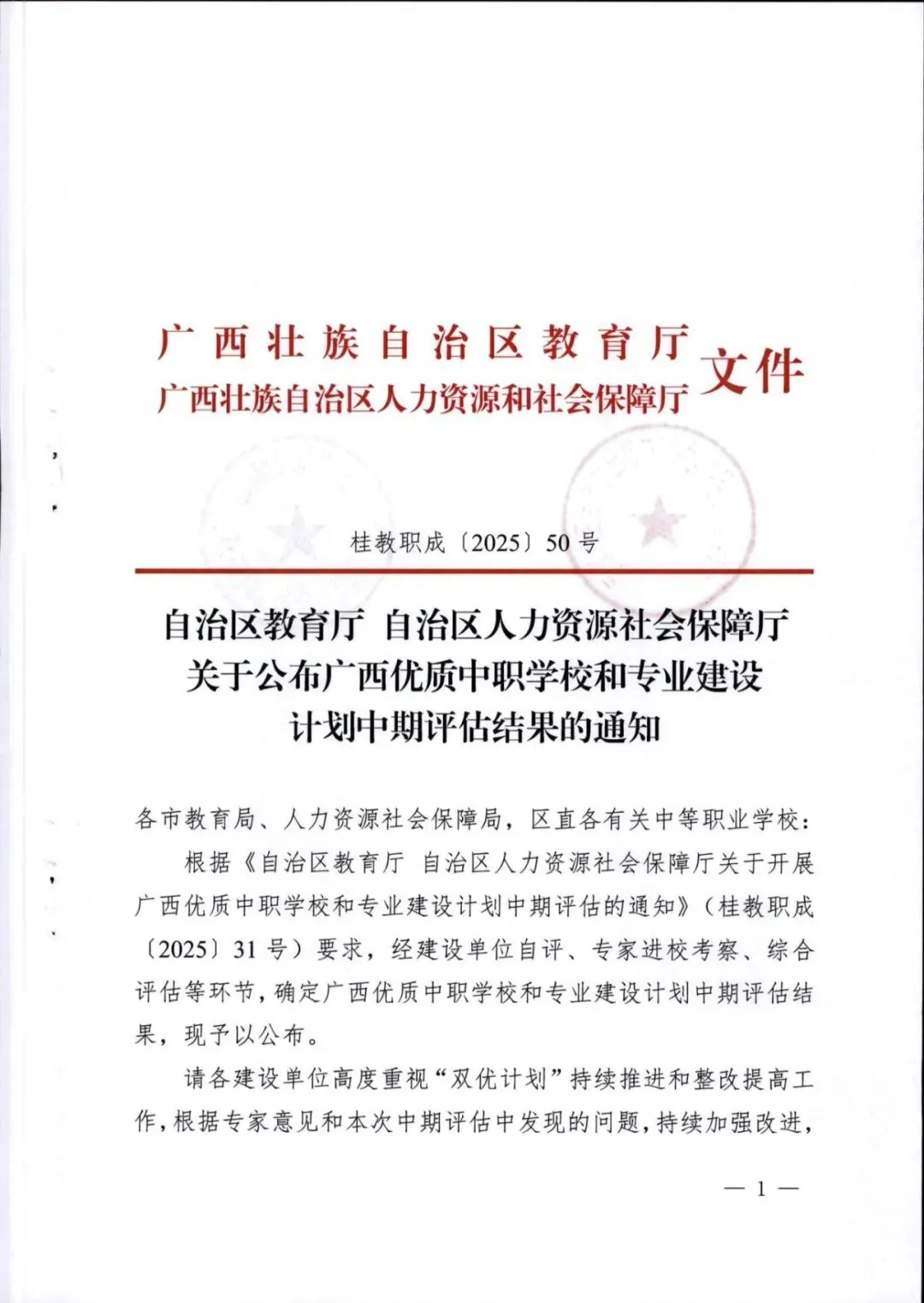 近日,广西壮族自治区教育厅、自治区人力资源和社会保障厅联合印发《关于公布广西优质中职学校和专业建设计划中期评估结果的通知》(桂教职成〔2025〕50号),正式公布全区“双优计划”中期评估结果。柳州市交通学校在本次评估中荣获“优秀”等级,办学实力获权威认可,充分彰显了学校在内涵建设、专业发展和人才培养等方面的显著成效,标志着学校高质量发展迈上了新台阶。