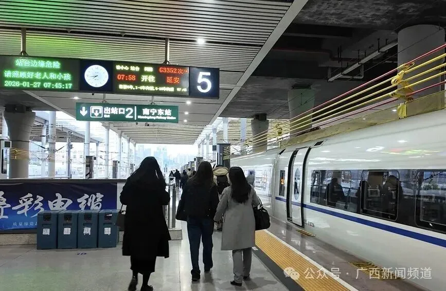 记者从国铁南宁局获悉,1月27日7时58分,首趟南宁东至延安的动车组列车G3352次驶出站台,标志着“绿城”南宁与“革命圣地”延安实现高铁直通,填补了两地无直达高铁的空白。