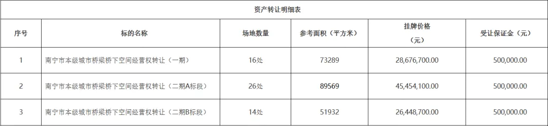 桥下空间具有一定的开发潜力,但同时也是管理难点,易出现违规搭建、乱堆乱放、无序使用等问题。作为“城市边角料”的桥下空间,在全国各地受到越来越多的关注,开发利用也愈发广泛,其中不乏成功案例。例如:佛山澜石大桥下原本狭小荒置的空间,变身新潮的滑板运动场;重庆九滨路高架桥墩及桥身打造了大规模的裸眼3D彩绘;青岛将部分桥下空间打造成“口袋公园”等。本案例为桥下空间的开发利用提供了参考。标的资产:通过梳理市本级城市桥梁桥下空间资源,符合盘活条件的桥下空间存量资源主要有:西明大桥南引桥桥下空间、良庆大桥北引桥桥下空间、仲龙路八尺江大桥桥下空间等56处,约22.6万平方米桥下空间资源。本次转让标的为目前闲置及非公益性使用的南宁市本级城市桥梁桥下空间经营权,桥下空间资源主要有:西明大桥南引桥桥下空间、良庆大桥北引桥桥下空间、仲龙路八尺江大桥桥下空间等56处,约21.48万平方米桥下空间资源。转让期限为20年,分别为一期、二期A标段、二期B标段共3项南宁市本级城市桥梁桥下空间经营权。南宁市本级城市桥梁桥下空间经营权转让分为一期及二期。一期内容为盘活目前桥下空间闲置场地,转让经营权,共计16处约7.33万平方米,成交后受让方可开展社会停车场、体育场所等服务市民的经营性项目;二期内容为对现状非公益性使用的桥下空间场地进行整合后转让经营权,共计40处约14.15万平方米(其中A标段共26处约8.96万平方米,B标段共14处约5.19万平方米),成交后受让方主要根据现状用途开展经营。一期、二期的业态均可根据实际情况进行调整,但不得违反《南宁市城市桥梁桥下空间使用管理办法(试行)》及相关法律、法规、规章等相关规定。备注:本项目二期A标段管理单位南宁交通投资集团有限责任公司对场地新增设施设备投入成本预计2,130.01万元。由于评估净地使用费未包含管理单位对场地新增设施设备成本或权益价值,据此,受让方应另行向管理单位支付场地改造成本2,130.01万元。盘活方式:将目前闲置及非公益性使用的桥下空间场地经营权进行整体打包,采取有偿转让经营权的方式进行盘活。中标者获取经营权后,可对桥下空间场地进行改造,开展社会停车场、球场等服务市民的经营性项目,获得长期稳定的经营性收益,实现“资源变资产、资产变资金、资金变资本”的盘活路径。盘活目的:南宁市本级城市桥梁桥下空间经营权转让项目盘活内容为转让目前闲置及非公益性使用的桥下空间场地经营权,对桥下空间场地经营权价值进行评估,转让期限按20年计算,预计盘活价值约1.26亿元。一是加强科学研究全盘谋划,主管部门多次参加市政府联席会、专题会等相关会议,并组织召开工作推进会、行政办公会、党委会等,深入研究桥下空间盘活路径,确保方向明确、措施精准;二是健全组织机制明责担责,成立桥下空间盘活工作领导小组,统筹内部资源,压实工作责任;三是多轮排查摸清资产底数,于2024年6月完成桥下空间基本调查,此后开展多轮复核,形成准确翔实的桥下空间经营权转让清单;四是依法依规完善制度保障,市市政园林局完成修订《南宁市本级城市桥梁桥下空间经营权转让实施方案》及转让合同;五是配合完成科学定价评估,第三方机构完成桥下空间资产评估,为科学定价提供依据;六是充分沟通确保落地生效,通过对接交易机构、桥下空间现状使用单位等,倒排项目挂牌计划、沟通场地清退等事宜,确保工作有序推进。注:本文来源网络,仅做学习交流使用,版权归原作者所有,如有侵权,请联系小编删除。
