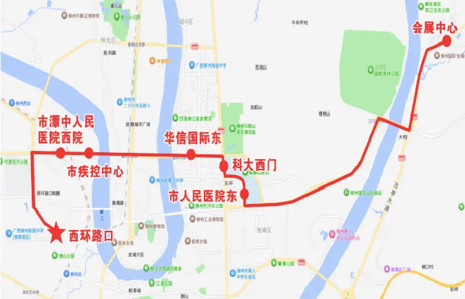 2.回程(柳州国际会展中心~西环路口):经新柳大道、桂柳路、文昌路、康顺路、东环大道、潭中东路、潭中西路、西环路至西环路口。沿线停靠的站点有:会展中心、市人民医院东、科大西门、华信国际东、市疾控中心、市潭中人民医院西院、西环路口。