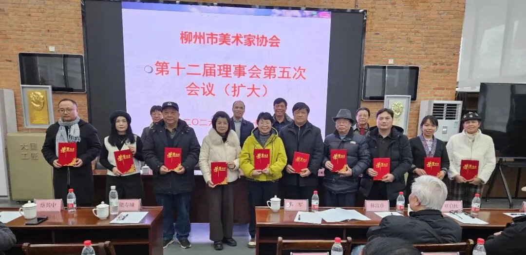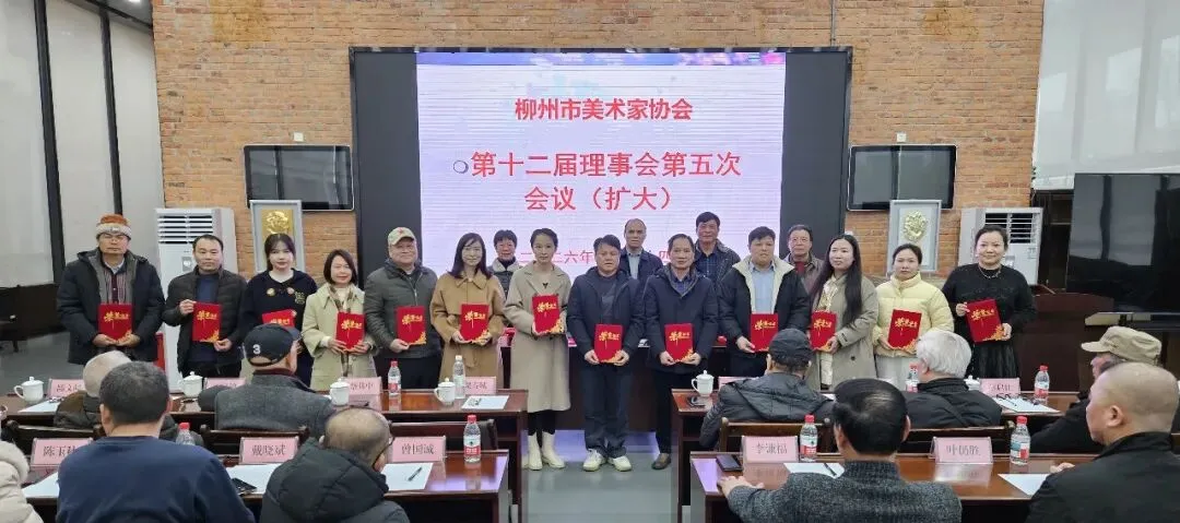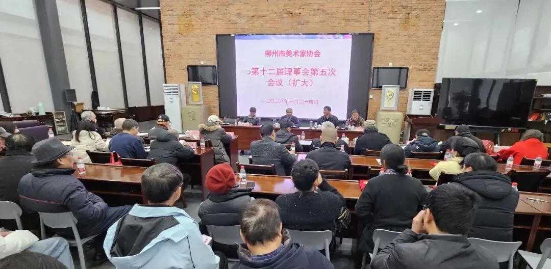 2026年1月24日下午,柳州市美协第十二届理事会第五次会议(扩大)在柳州工业博物馆历史馆召开。柳州市文联党组书记、主席黄才强,市文联党组成员、副主席蒋玉出席会议。市美协主席欧顺红,市美协主席团成员,市美协理事会成员,美协优秀会员以及老美术家代表林富章、王培堃、蔡其中、梁寿城、邓军、王邦、覃启仕、贺立言等50余人参加会议。会议由市美协常务副主席李心军主持。