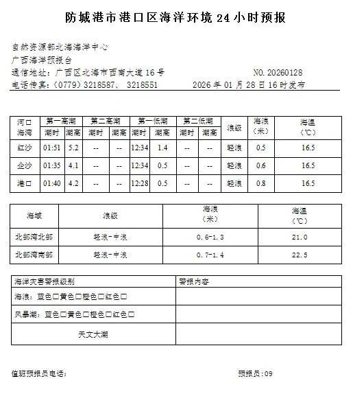 >2026年1月28日防城港市港口区海洋环境24小时预报
