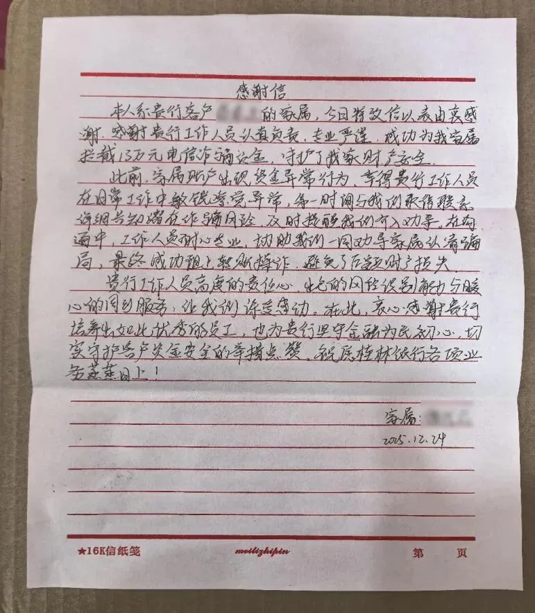 几天后,谌女士捧着一封手写感谢信再次来到柳州东环支行网点,工整的字迹里满是真挚的谢意。一股暖流从覃丽芳心底蔓延开来,所有的忙碌与紧张都化作了继续前行的力量。