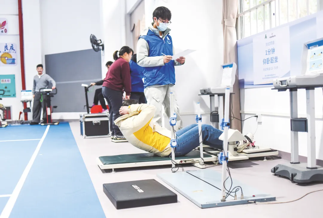 “深吸一口气,慢慢呼出,对,保持这个节奏。”在肺活量测试区,工作人员指导20多岁的李松霖完成测试,并记录数据。李松霖是第一次来“两中心”,他说:“测试项目包括身体柔韧性、反应速度等,测试结束后,我还得到了一份详细的‘运动处方’。了解自己体质上的短板,我可以有针对性地锻炼。”