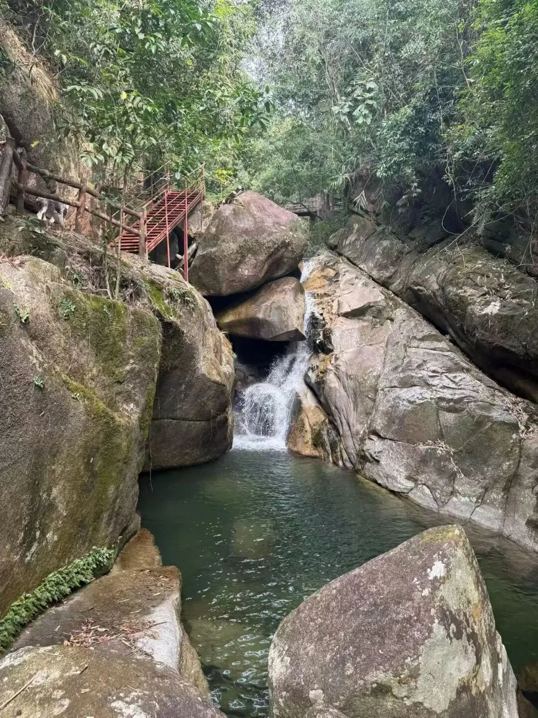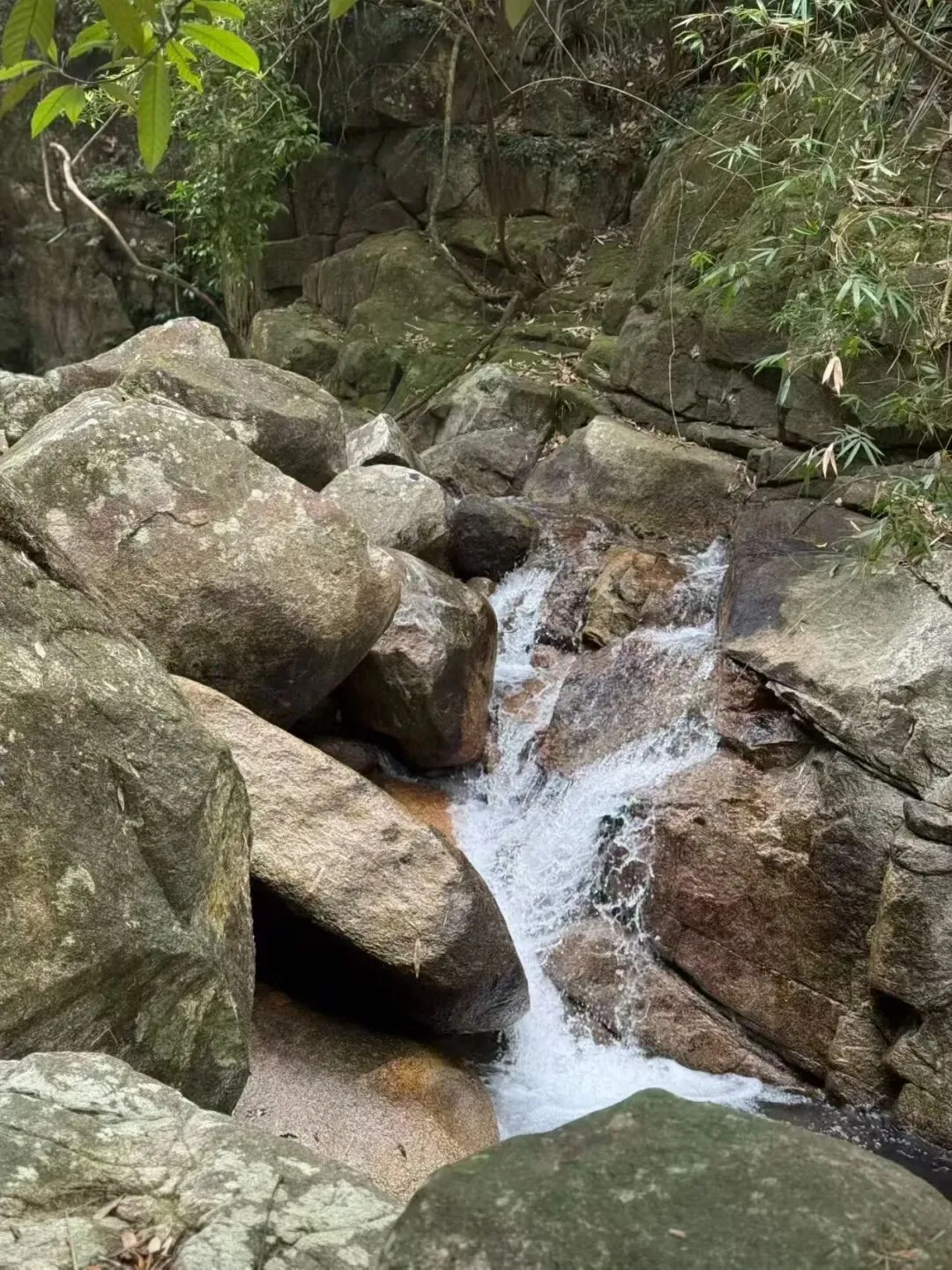 东兴屏峰雨淋公园谷床全是洁净的花岗岩,千年流水冲刷,石头裸露了原色,殷红如血。