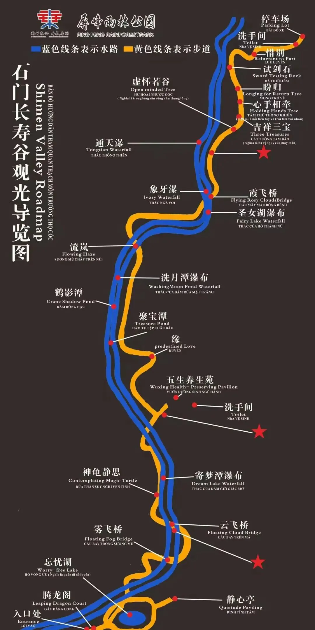 溪水随着谷床的变化成潭、成湾、成瀑布;谷道两岸茂林修竹簇拥,危崖中闲。