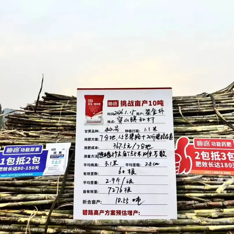 这份亮眼成绩的背后,离不开碧路肥料的精准赋能。梁大哥表示,这片7分地的桂糖44号在培土阶段使用了1.5包碧路药肥,后期壮尾关键期追加20斤蔗碧路尿素。碧路高浓度长效双标甘蔗肥,氮磷钾浓度远超普通肥料,能为甘蔗苗期补足养分、促苗壮根,还特别添加德国进口 DMPP,可稳效缓释养分、避免后期脱肥。而蔗碧路尿素凭借双脲酶抑制剂与伽马氨基丁酸的双重增效技术,肥效长达90-150天,既能保证前期长势,又能为后期壮尾提供持续养分,真正实现“减肥增效”。