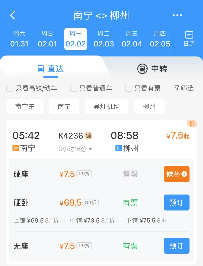 目前,该趟车次南宁至柳州方向2月2日的硬座票已售罄,无座票仍可购买,2月3日则余票充足。