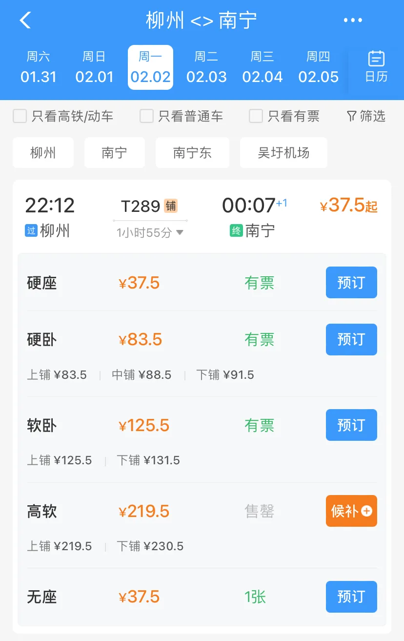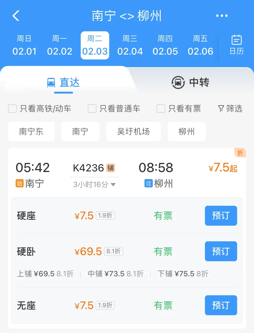 而柳州至南宁方向暂未出现折扣票,最低票价为37.5元。