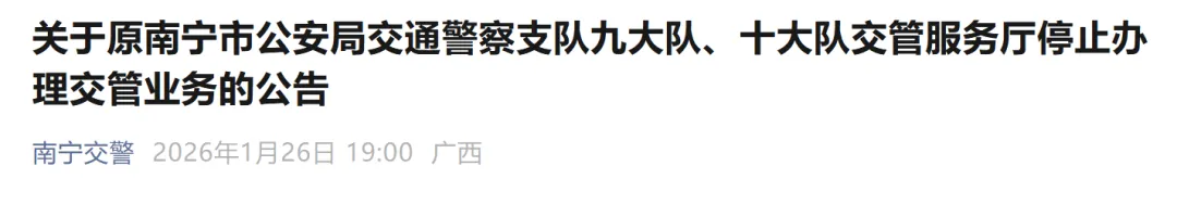 1月26日,南宁交警发布《关于原南宁市公安局交通警察支队九大队、十大队交管服务厅停止办理交管业务的公告》,具体内容如下👇