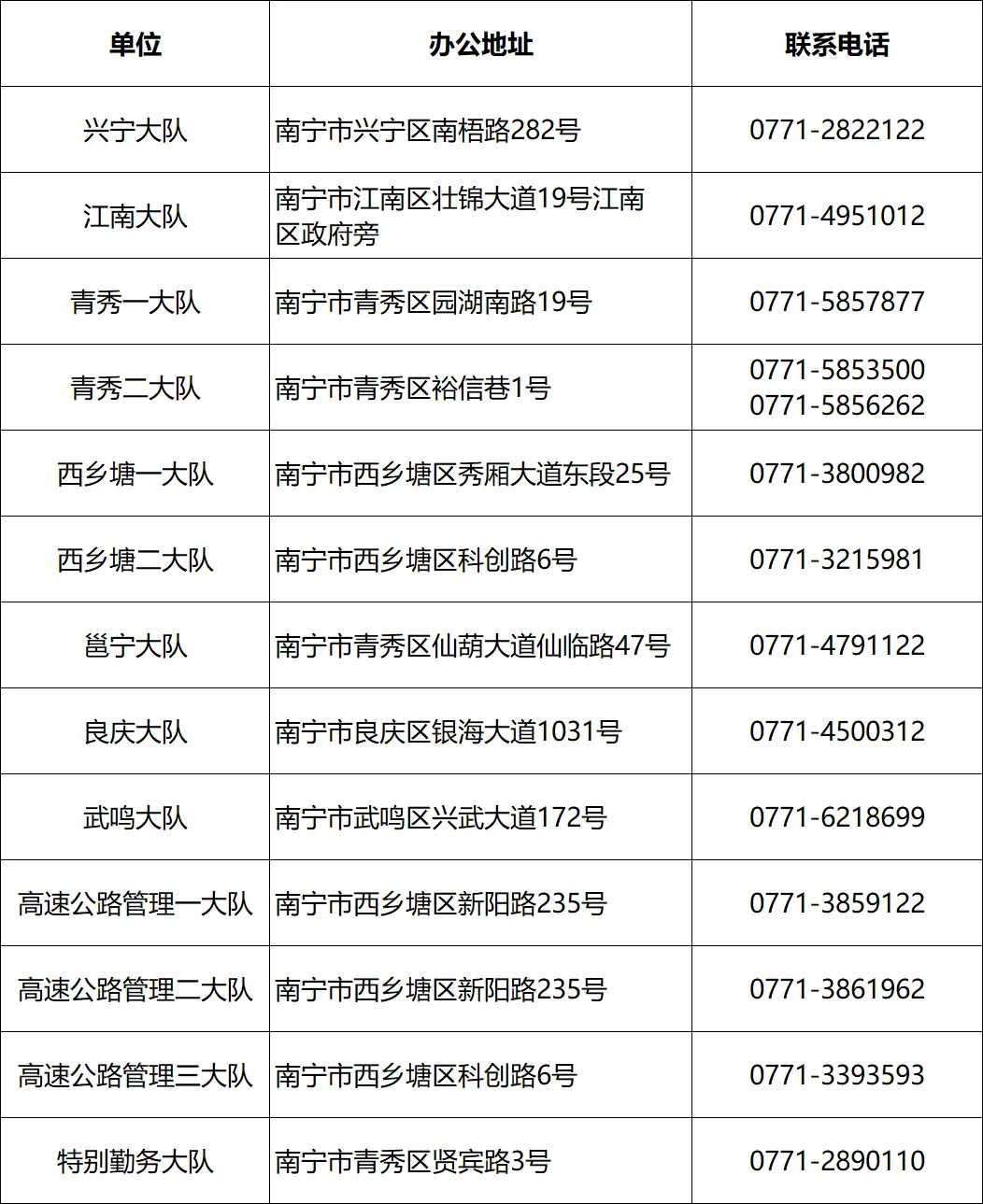 附:南宁市公安局交通管理支队下设各执法大队办公地址及