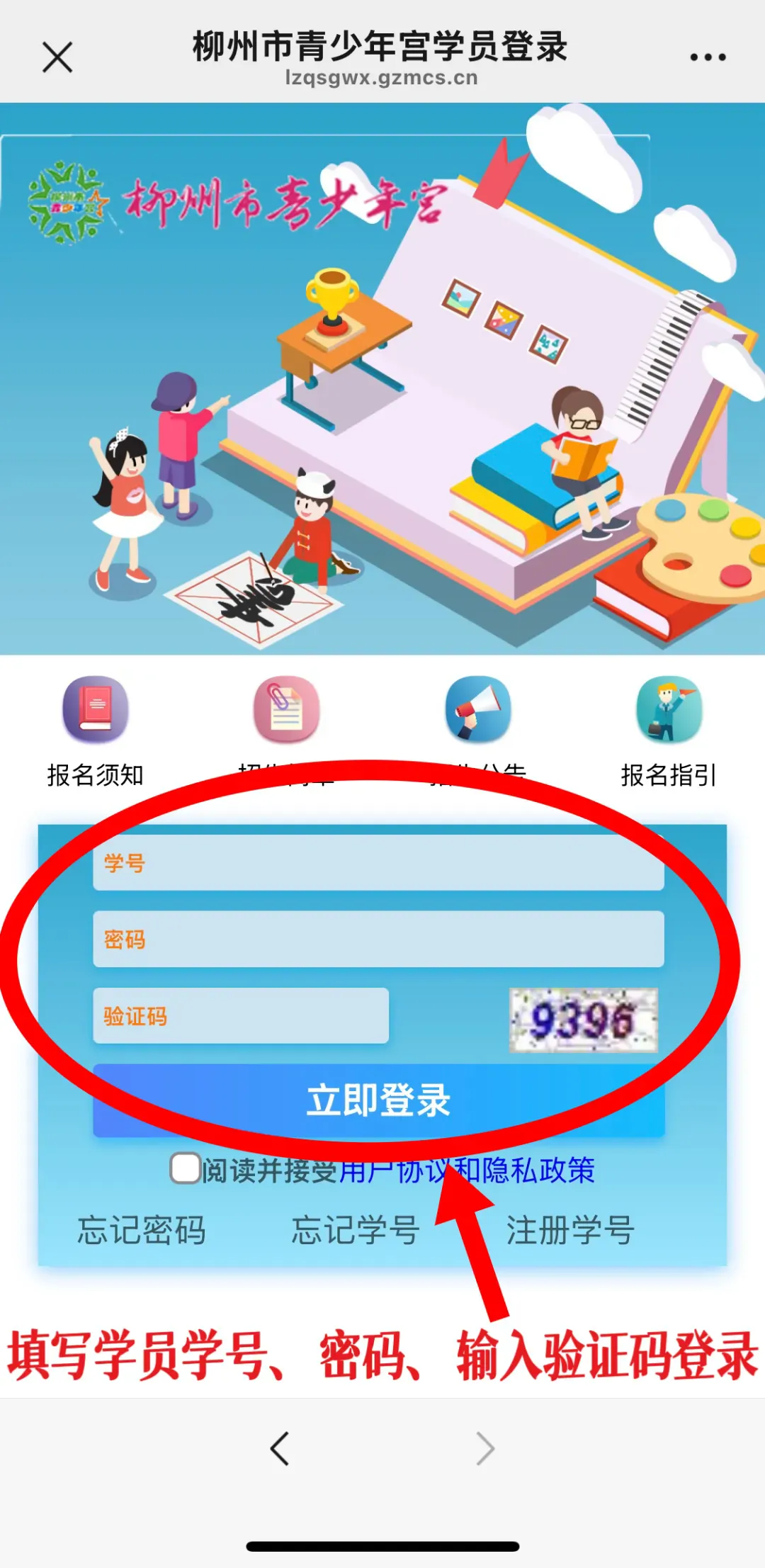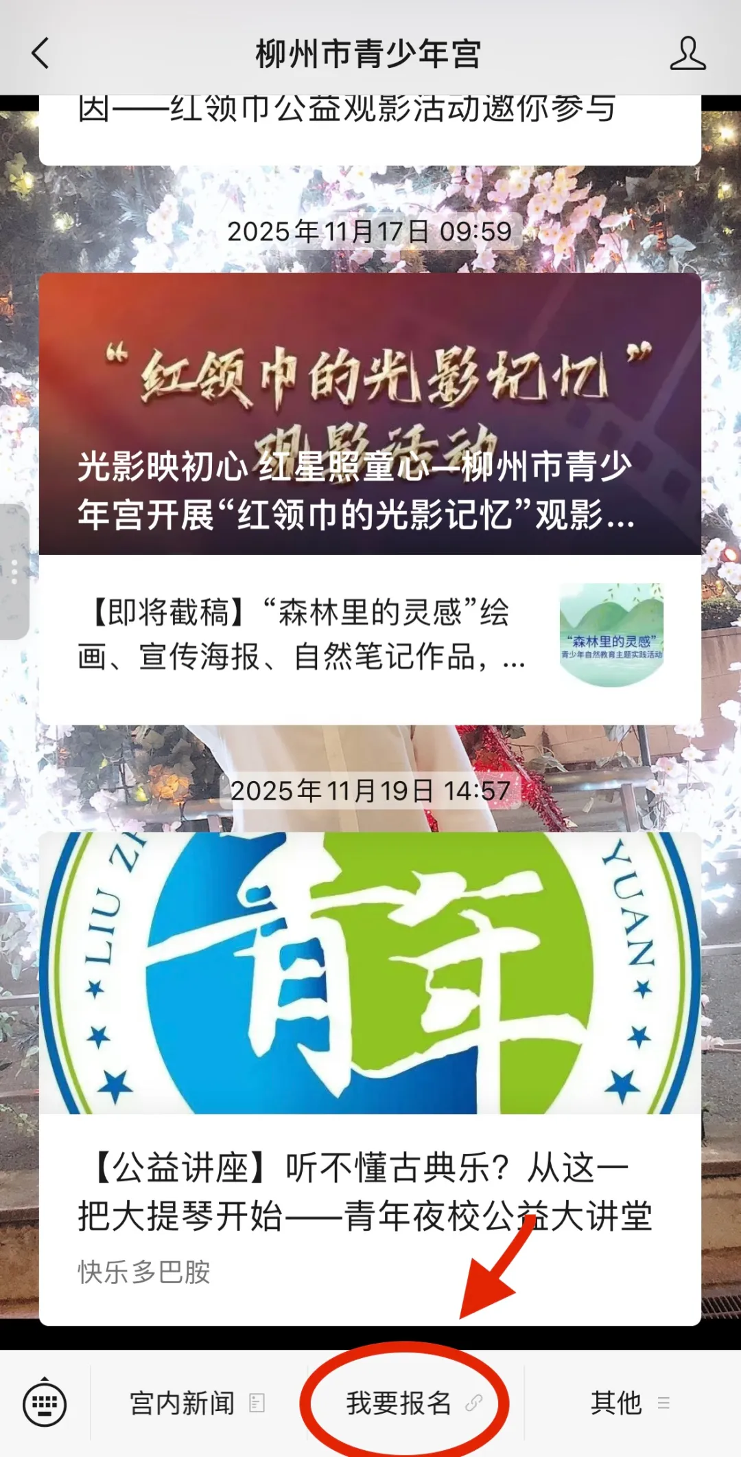 通过搜索或者扫码进入“柳州市青少年宫”的微信公众号,点击下方的【我要报名】;