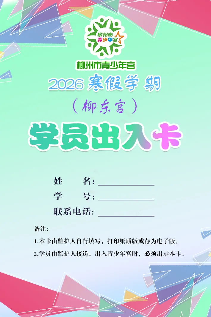 首次来我宫上课,家长请把孩子送进教室。开课前,请家长在下方链接自行下载并打印填写《柳州市青少年宫2026年寒假学期学员安全承诺书》,在第一节课交给任课教师。