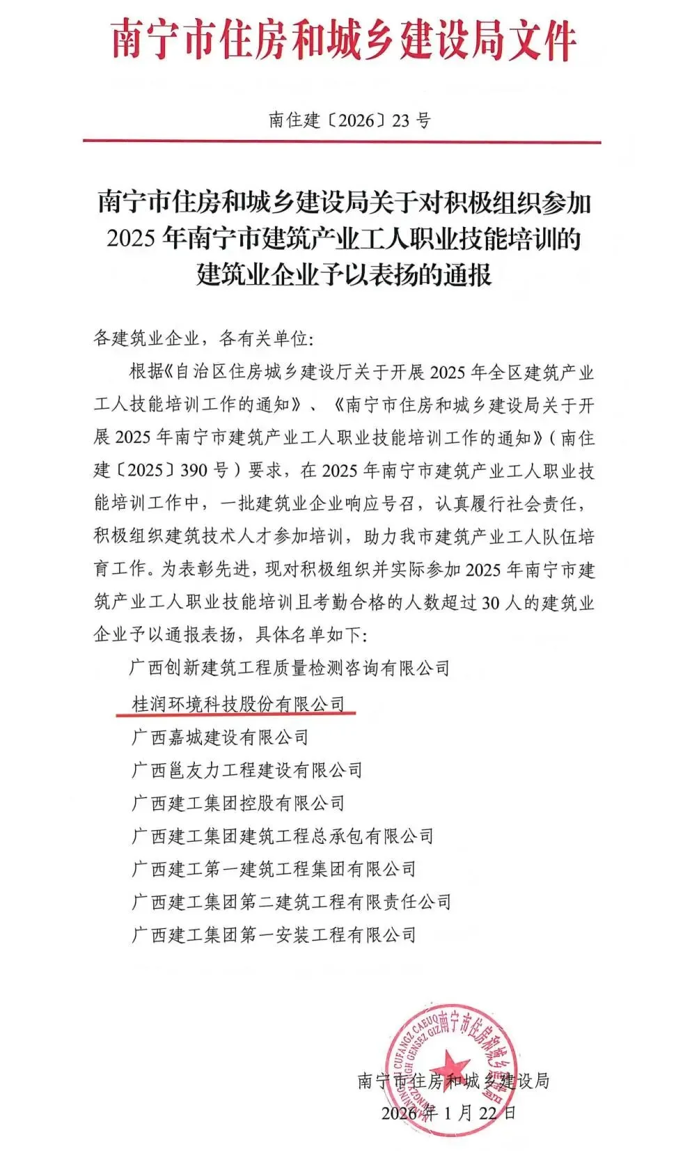 近日,南宁市住房和城乡建设局对在2025年南宁市建筑产业工人职业技能培训组织工作中表现优异的企业予以表扬,桂润环境因积极组织技术人员参训、考勤合格人数达标,荣列受表扬单位。