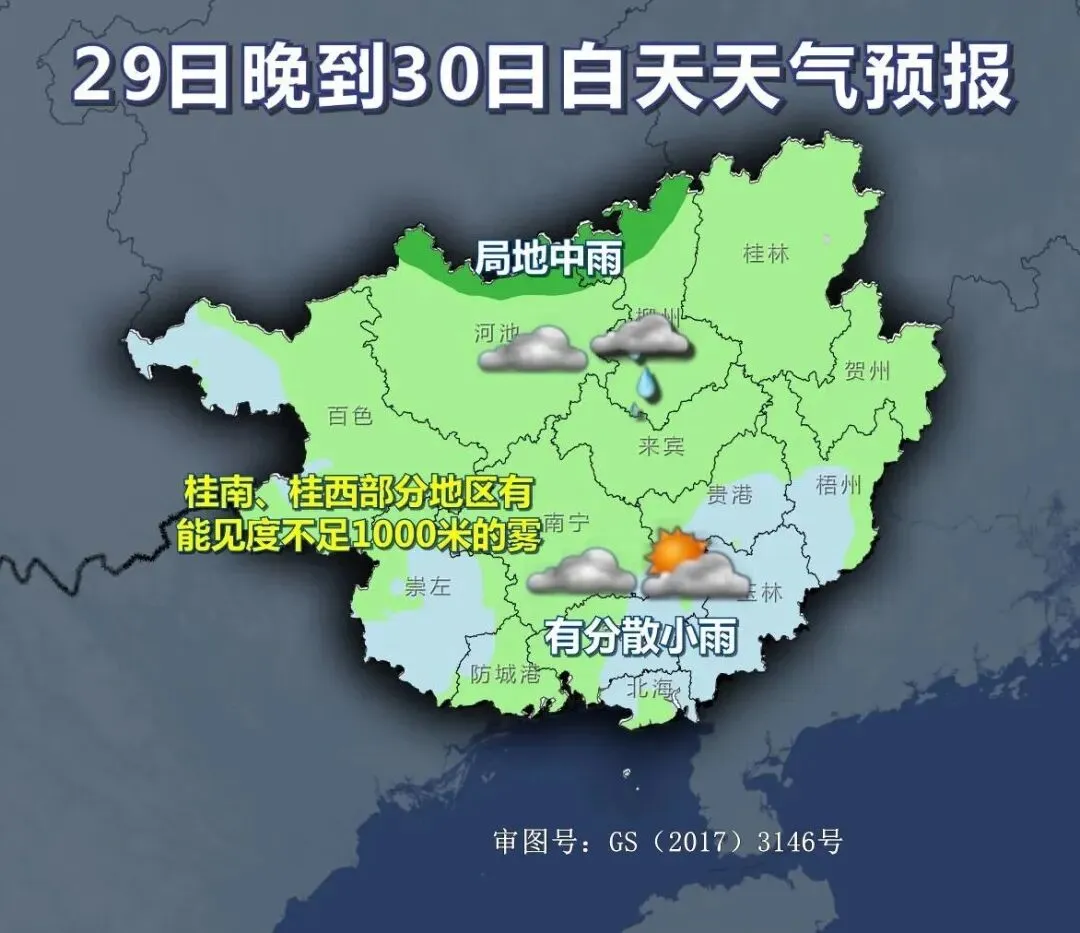 30日白天到晚上,桂北阴天有小到中雨、局地大雨,桂南阴天有小雨。桂南、桂西部分地区有能见度不足1000米的雾。高寒山区局地有冰冻和道路结冰。最低气温:高寒山区-3~3℃,桂东北3~8℃,沿海15~17℃,其它地区8~15℃。