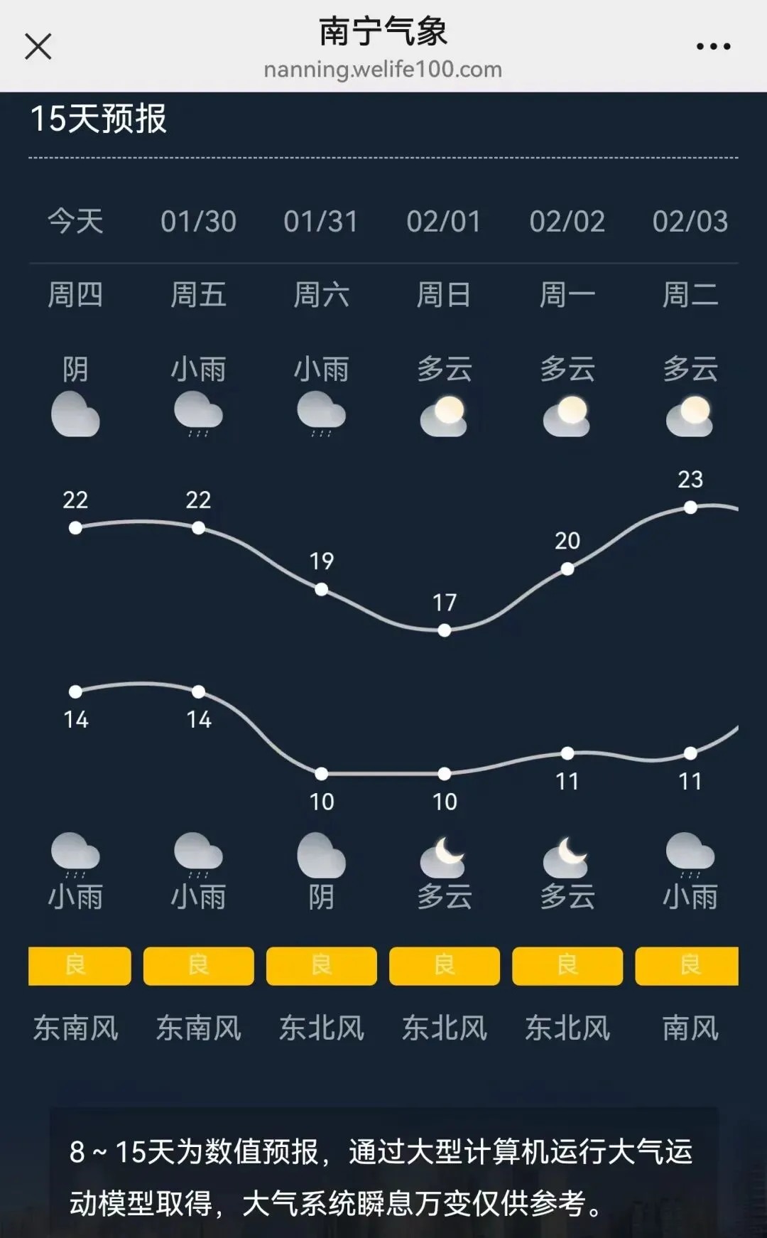 南宁市气象台预计,29—30日,阴天间多云,有小雨,有雾。最低气温15℃左右,最高气温22℃左右。