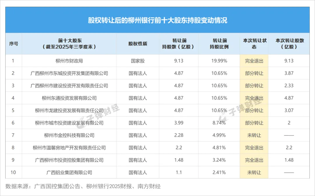 此次股权转让涉及柳州银行原有的11家股东,其中该行原有第一大股东是柳州市财政局(持股19.99%),转让其所持有该行的全部股权,最终“完全退出”。