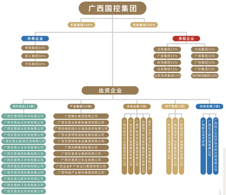公开资料显示,广西国控成立于2025年7月,注册资本110亿元,从其官网披露的组织架构可见,广西国控是由广西农垦集团、广西宏桂集团等企业组建而成。
