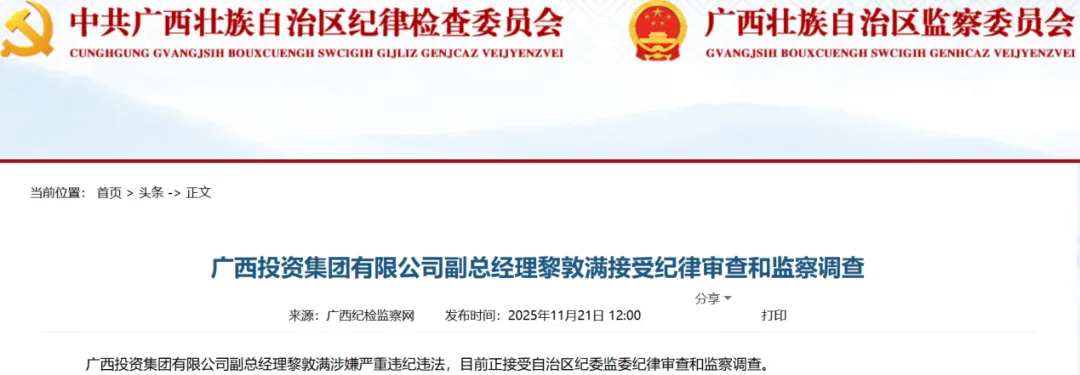 最新消息显示,广西纪委监委在2025年11月底披露,广西投资集团有限公司副总经理黎敦满涉嫌严重违纪违法,目前正接受自治区纪委监委纪律审查和监察调查。