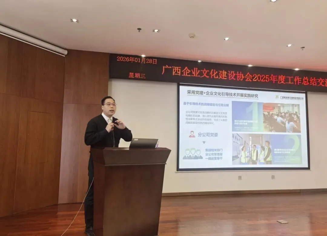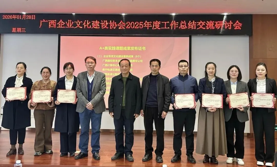 在 “党建+企业文化引导技术” 实践课题评选中,课题《高质量党建引领高速公路运营标杆打造的逻辑与路径优化研究——以广西新发展交通集团南宁运营分公司为例》荣获A+类成果。课题围绕运营标杆企业建设,将“党建+企业文化引导技术”深度融入运营管理链条,用于构建“先锋领办”协同机制,实现了从战略到任务的高效转化与保障体系的全流程设计,思路清晰、实践扎实、成效显著。