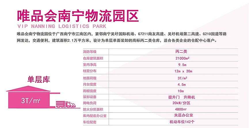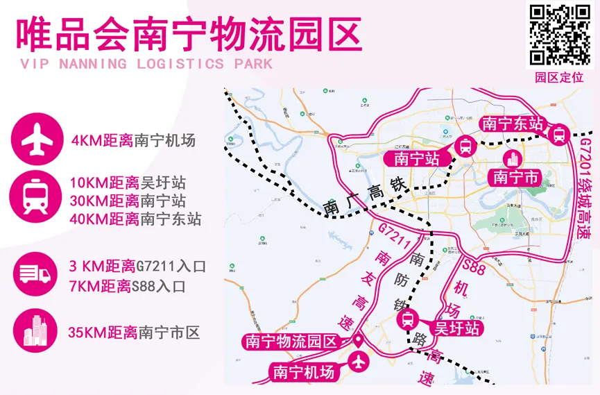 唯品会南宁园区位于经开区吴圩镇友谊路北,距离南宁吴圩国际机场仅4km,和吴圩火车站的距离10km,这一地理优势使得物流园能够迅速响应航空物流需求,为进出口货物提供高效、便捷的运输服务。