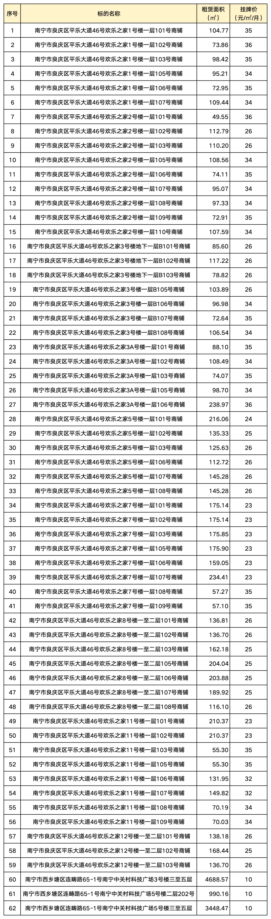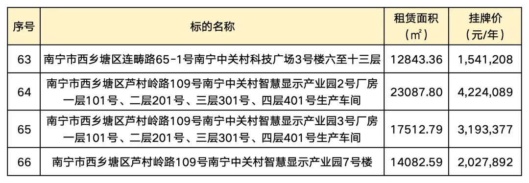 标的简介:标的1-59位于南宁市良庆区平乐大道、标的60-63位于西乡塘区连畴路、标的64-66位于西乡塘区芦村岭路,目前闲置。
