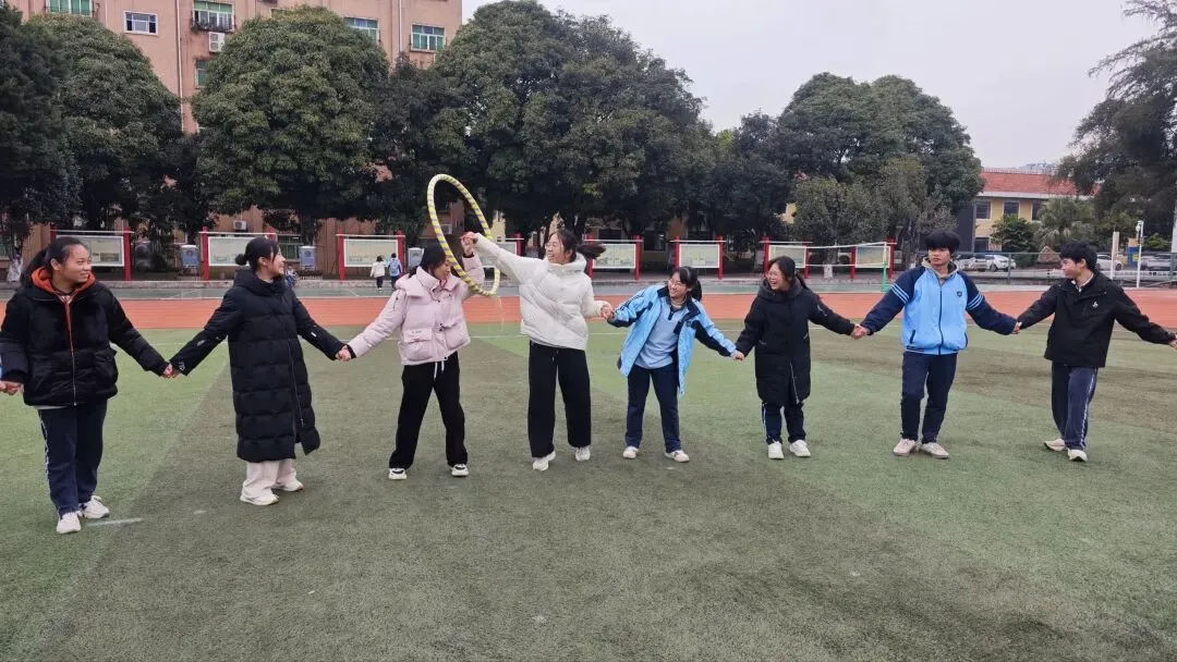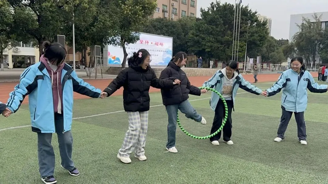 活动在融洽热烈的氛围中展开,韦维副校长、胡仕锦副校长及高三年级教师共同参与活动。“一圈到底”环节,各班师生手拉手围成圆圈,默契协作,让呼啦圈在彼此间灵活传递。班长们率先登台,铿锵有力地喊出班级的用时目标和激昂口号,随后全体成员齐心协力向目标发起冲击。每一次成功挑战,都伴随着热烈的掌声与欢呼,师生共同为集体的进步由衷庆祝。