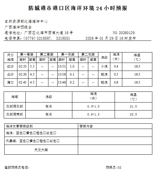 >2026年1月29日防城港市港口区海洋环境24小时预报