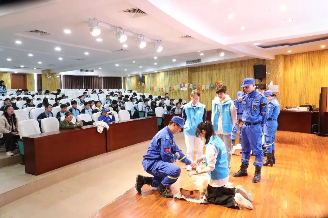 理论讲解后,救援队队员指导学生进行了分组实操练习。学生们在模型上认真练习胸外按压、人工呼吸等技能,并在指导下模拟使用AED。队员逐一纠正动作,确保操作规范。