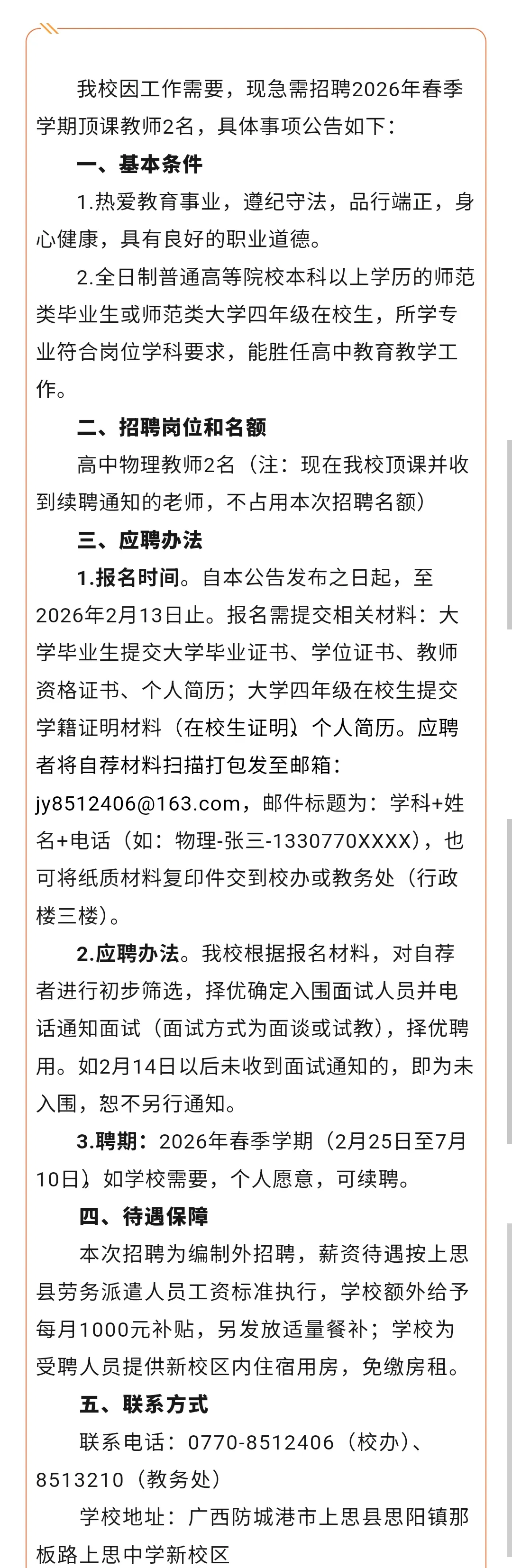 防城港教师招聘:防城港市上思中学招聘