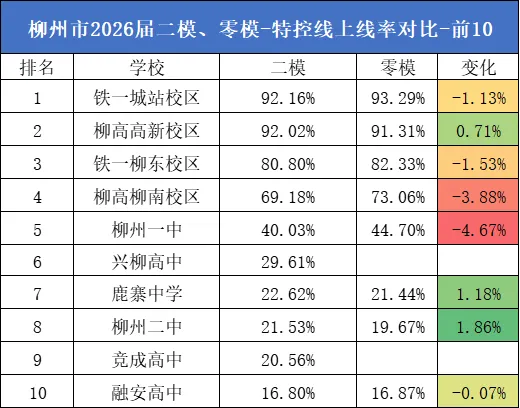 >柳州市2026届二模、零模-特控线上线率对比-前10
