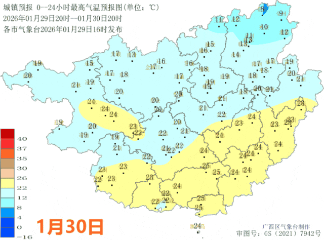 30日上午至2月1日,受较强冷空气影响,桂东日平均气温下降4~6℃、局地8℃以上,桂西下降2~4℃、局地6℃以上。