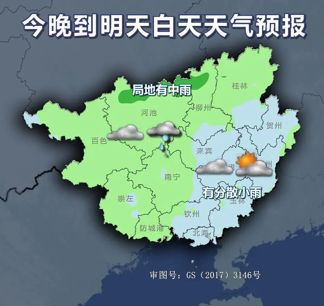 29日晚上到30日白天,桂林、柳州、来宾、河池、百色、崇左、南宁、防城港和钦州等市阴天有小雨、局地中雨,其它地区阴天到多云有分散小雨。百色、河池、柳州、桂林、来宾、崇左、南宁、防城港、钦州、玉林等市的部分地区有能见度不足1000米的雾,局地有能见度不足200米的强浓雾。最低气温:桂东北6~13℃,其它地区13~17℃。