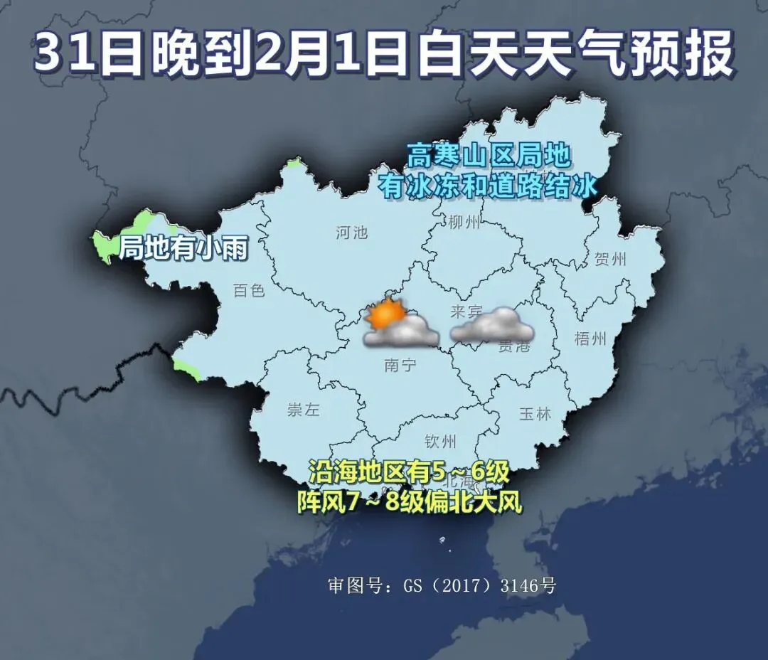 31日晚上到2月1日白天,全区多云到阴天,其中桂西北局地有小雨。高寒山区局地有冰冻和道路结冰。沿海地区有5~6级、阵风7~8级偏北大风。最低气温:高寒山区-4~2℃,桂东北2~7℃,其它地区7~13℃。