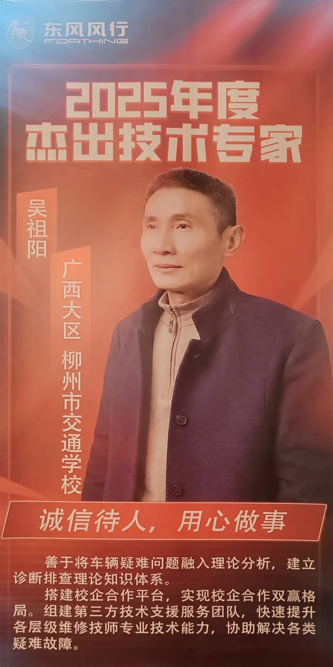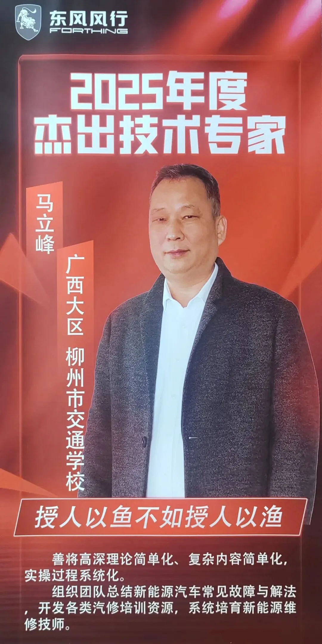近日,东风风行2026年合作伙伴大会在柳州隆重举行。会上,柳州市交通学校的马立峰、吴祖阳两位教师双双获评东风柳州汽车有限公司“2025年度杰出技术专家”荣誉称号,这是本次全国十大杰出技术专家中仅有的两位来自学校的技术专家。