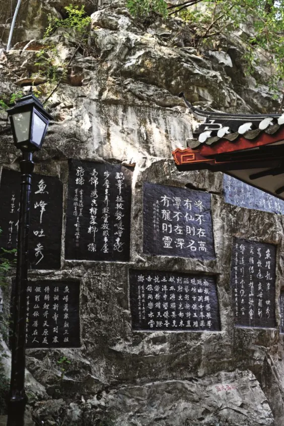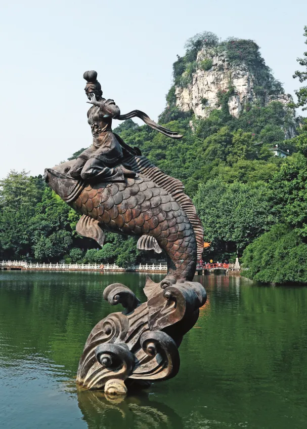 鱼峰山因柳宗元在《柳州山水近治可游者记》中描述“山小而高,其形如立鱼”而得名“立鱼峰”。驻足小龙潭东南岸眺望,山峰果真如鲤鱼跃出碧波,生动诠释了“南潭鱼跃”的意趣。
