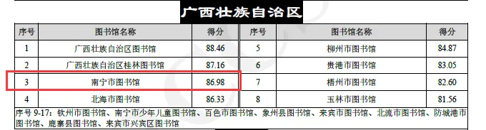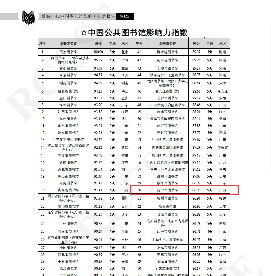 武汉大学中国科学评价研究中心等单位联合发布了《数智时代中国图书馆影响力指数报告(2025)》。报告显示,在参评的全国1980家各级公共图书馆中,南宁市图书馆以86.98的得分,位列“中国公共图书馆影响力指数”第60位,广西公共图书馆第3位,获评“五星级”图书馆,跻身全国公共图书馆高影响力梯队。